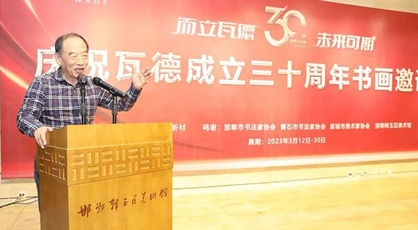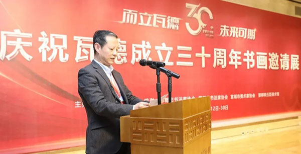 瓦德集團董事長謝富強向與會的各路藝術(shù)家及賓朋表達了熱情歡迎。向河北邯鄲、湖北黃石、安徽宣城三地文聯(lián)、書協(xié)、美協(xié)和書畫家們的大力支持表達了衷心感謝。尤其對中國知名書畫家,邯鄲市書協(xié)主席,文化名人,著名企業(yè)家韓玉臣先生對瓦德集團慶典活動的鼎力支持表達了深深的敬意和由衷地感謝。在三千年歷史的趙國都城邯鄲,能有瓦德集團如此注重文化藝術(shù)的實屬難得,能將深厚的中國文化的脈絡(luò)注入到自己的企業(yè)產(chǎn)品中非常難得。